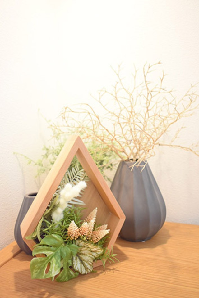 ハンドメイドの木製フレームにフェイクグリーンをアレンジした作品です。 滴型の可愛いフレームに、淡い色合いのベロニカが明るく楽しく咲きます。 玄関から寝室まで、見る人を楽しませる、可愛くお洒落なインテリアです。 新居祝いや開院祝い、お祝いの品としていかがでしょうか?