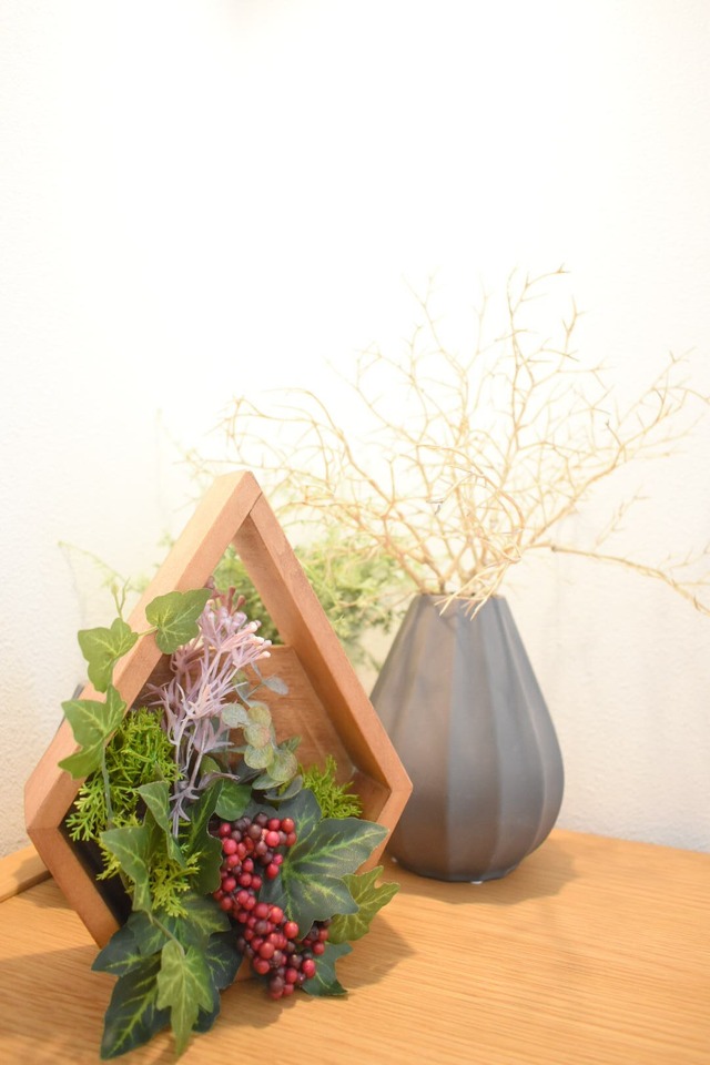 ハンドメイドの木製フレームにフェイクグリーンをアレンジした作品です。 滴型の可愛いフレームに、ベリーをアレンジしたアクセントのあるデザイン。 お部屋を飾る、ナチュラルでお洒落なワンポイントにどうぞ。 新居祝いや開院祝い、お祝いの品としてもいかがでしょうか?